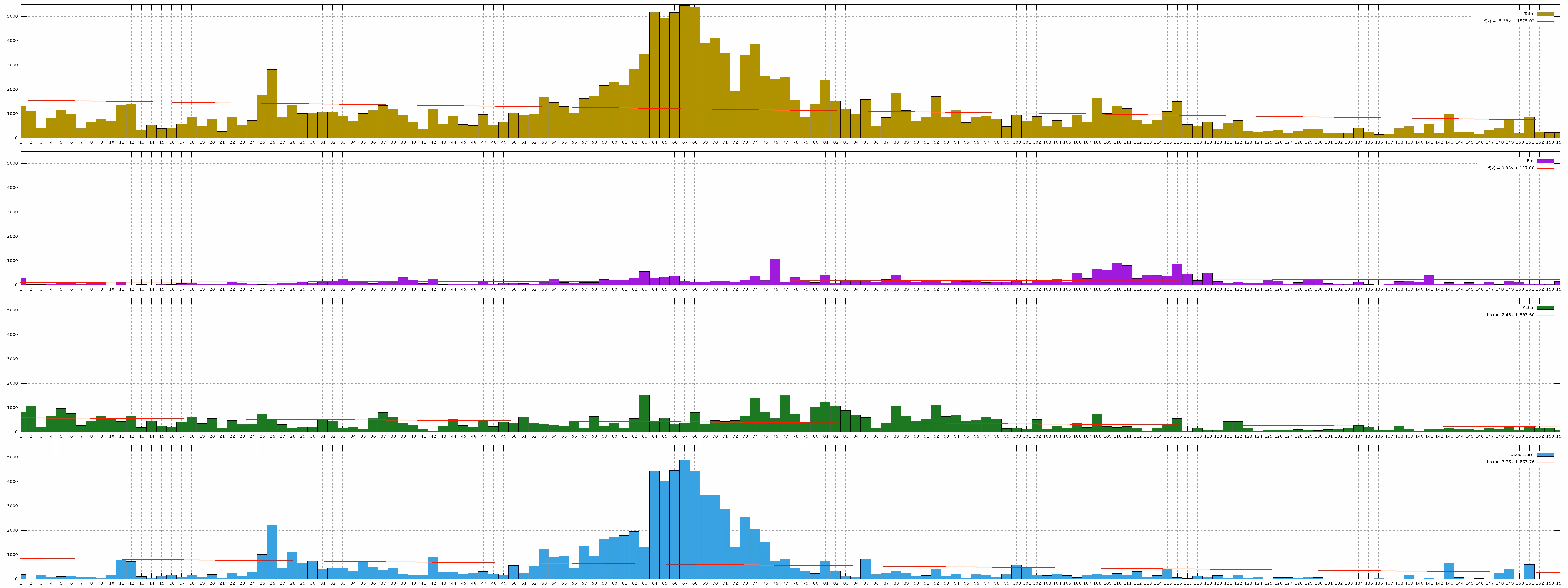 the #soulstorm channel. Green is messages in the off-topic #chat channel. Purple is every other