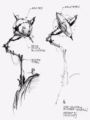 This area also features the so-called bladders. These are inflated balloons of animal-bladders hanged onto poles with what appears to be antennas sticking out of them. The game never acknowledges them, but it is pretty obviously part of ancient Mudokon tech, (concept art released later further confirms this.)