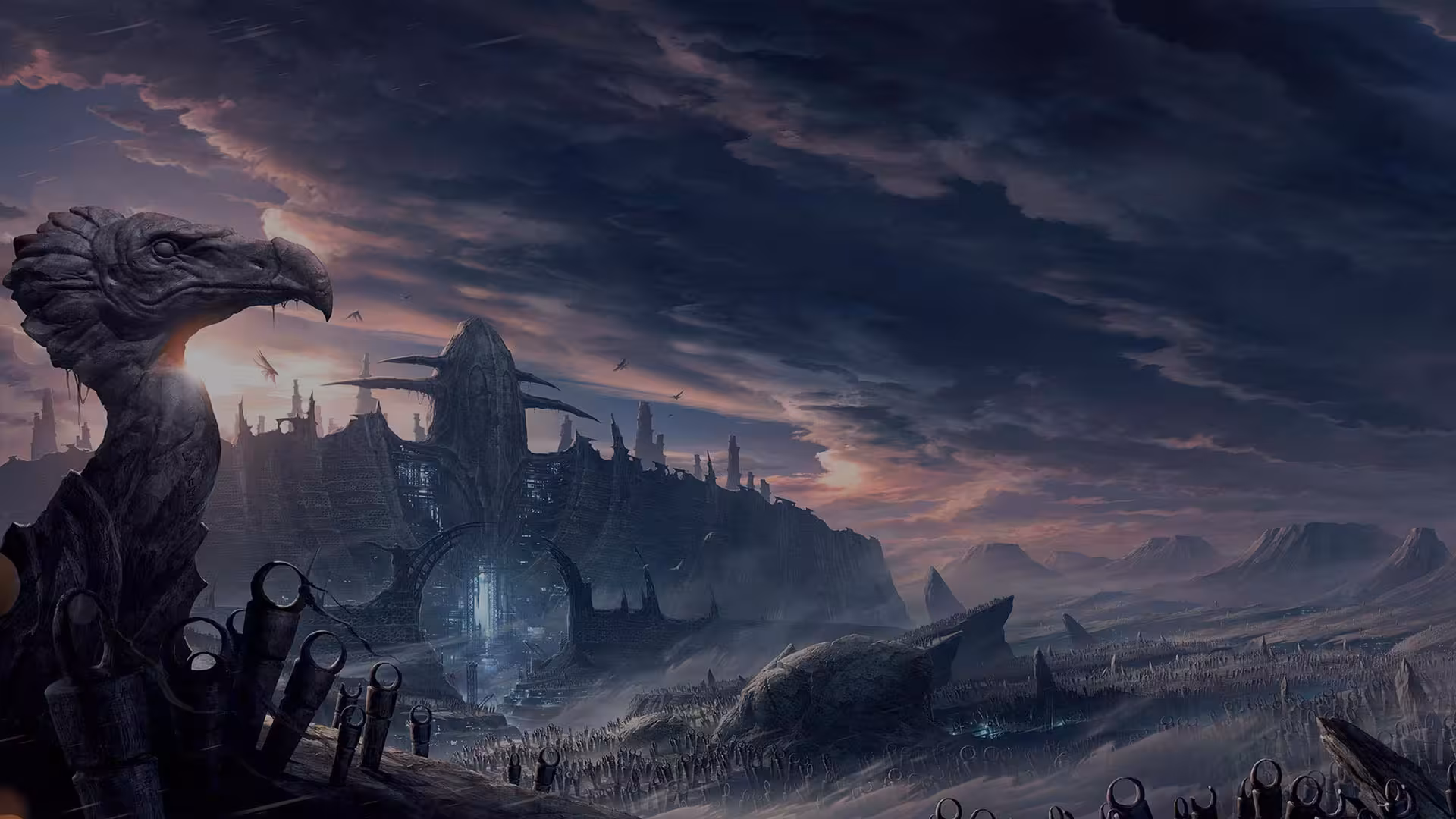 What gives more weight to this observation is the fact that we’ve seen very similar bird statues and a similar color palette in the matte painting of Necrum done by Raymond Swanland.