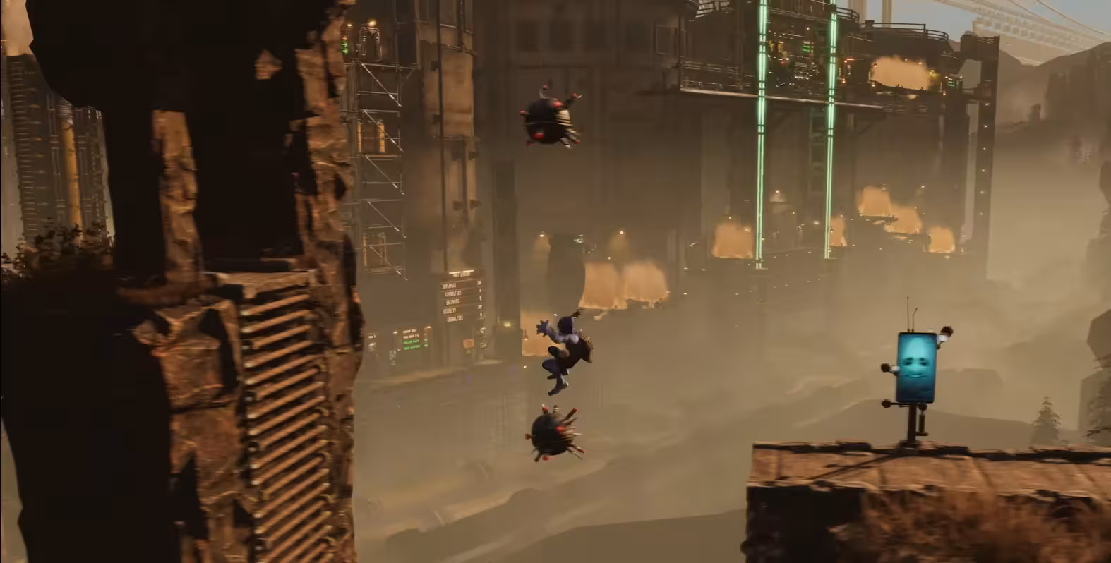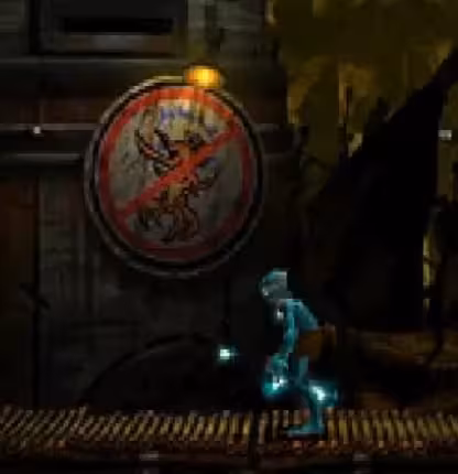The next scene is a continuation of the escape of Abe and co. from earlier. We see that while the Mudokons navigate by themselves without manual input, Abe is being harassed by another flying Slig, who blows up the ramp in front of him.