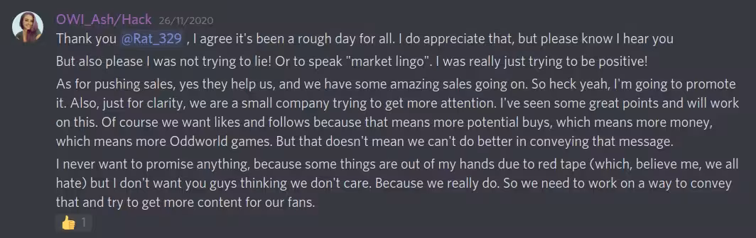 The stagnation of the media campaign sparked an active conversation on OWI’s Discord server, where several fans discussed their displeasure at the state of things. This ultimately prompted the company’s community manager, Hackattack, to chime in trying to calm the rightfully frustrated fans reassuring them that OWI does in fact care and that they’ll need to figure out a better way to convey things and deliver content. What this entails is not yet known as at the time of writing nothing has changed yet.